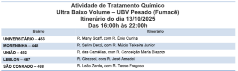 As equipes da Coordenadoria de Controle de Endemias Vetoriais (CCEV) atuarão nos bairros Universitário, Moreninha, União, Leblon e São Conrado. Para maior eficácia, os moradores devem abrir portas e janelas, permitindo que o inseticida alcance os locais onde os mosquitos se concentram.