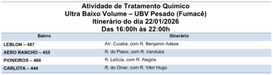 Moradores de quatro bairros de Campo Grande recebem, nesta quinta-feira (22), o reforço do fumacê no combate ao mosquito Aedes aegypti, transmissor da dengue, zika e chikungunya. A borrifação com inseticida será feita em Jardim Leblon, Aero Rancho, Pioneiros e Vila Carlota.