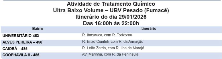 De acordo com a Secretaria Municipal de Saúde (Sesau), as equipes da Gerência de Controle de Endemias Vetoriais (GCEV) irão circular das 16h às 22h pelos bairros Universitário, Alves Pereira, Caiobá e Coophavila II. O objetivo é reduzir a população de mosquitos adultos em áreas com registro de circulação viral ou risco elevado de transmissão.