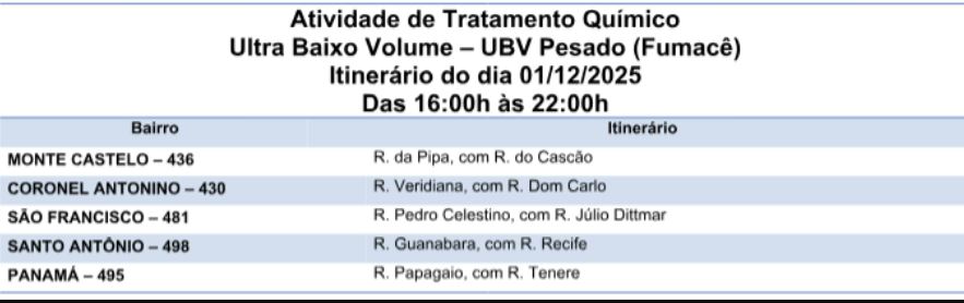 O serviço pode ser adiado ou cancelado em caso de chuvas, ventos fortes ou neblina, que prejudicam a aplicação do veneno. O inseticida age principalmente contra mosquitos adultos fêmeas, responsáveis pela transmissão das doenças, mas também pode afetar outras espécies, exigindo aplicação criteriosa.