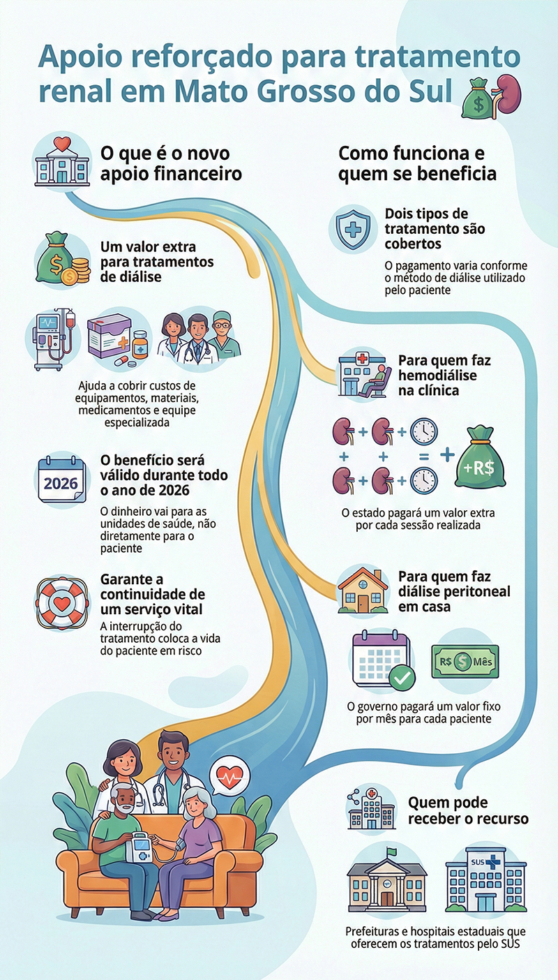 O Governo de Mato Grosso do Sul decidiu colocar dinheiro extra em 2026 para ajudar no tratamento de quem precisa de hemodiálise ou diálise em casa pelo SUS - (Foto: Arte A Crítica)Esse dinheiro a mais ajuda a cobrir custos como equipamentos, materiais, medicamentos e equipe especializada, que são altos e constantes.