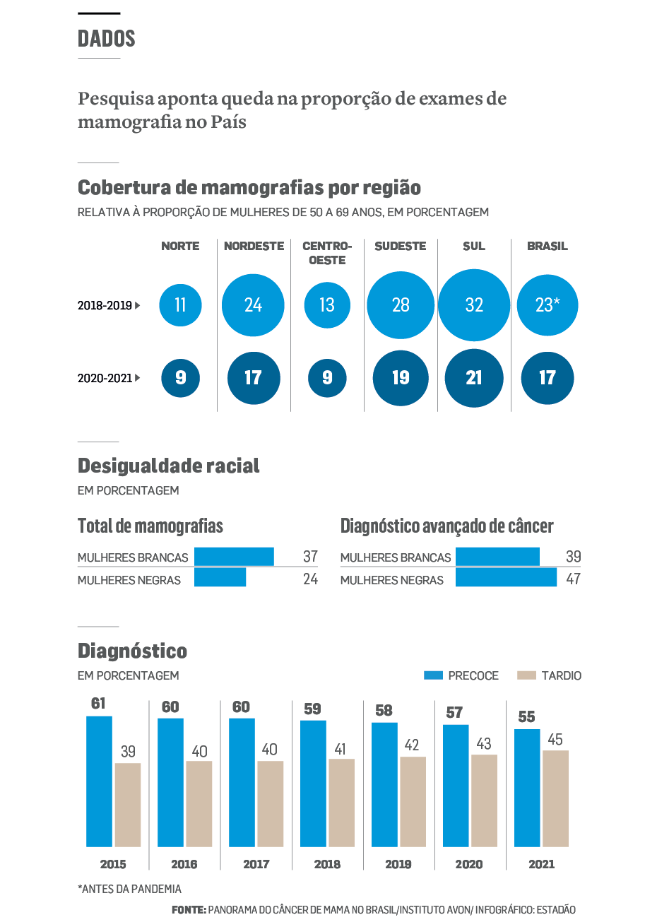 O levantamento foi realizado pelo Instituto Avon e pelo Observatório de Oncologia, com base nas informações do DataSUS de 2015 a 2021 e foco nas mulheres de 50 a 69 anos por recomendação do Ministério da Saúde, que prioriza a faixa etária no rastreamento da doença. Os dados apontam para uma queda de 40% dos exames realizados entre 2019 e 2020 e de 18% no ano seguinte. "Isso ainda é um reflexo da pandemia. Ainda temos uma sobrecarga de demanda das pessoas que deixaram de fazer esse tipo de exame, além da questão do medo (de se infectar com a covid)", explica Nina Melo, coordenadora do Observatório de Oncologia.