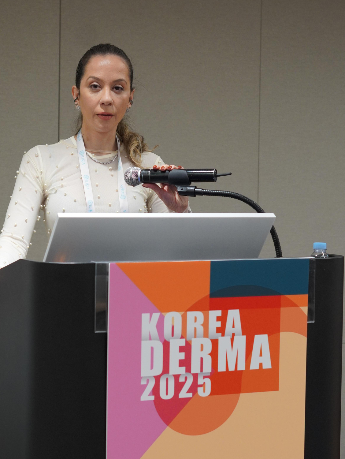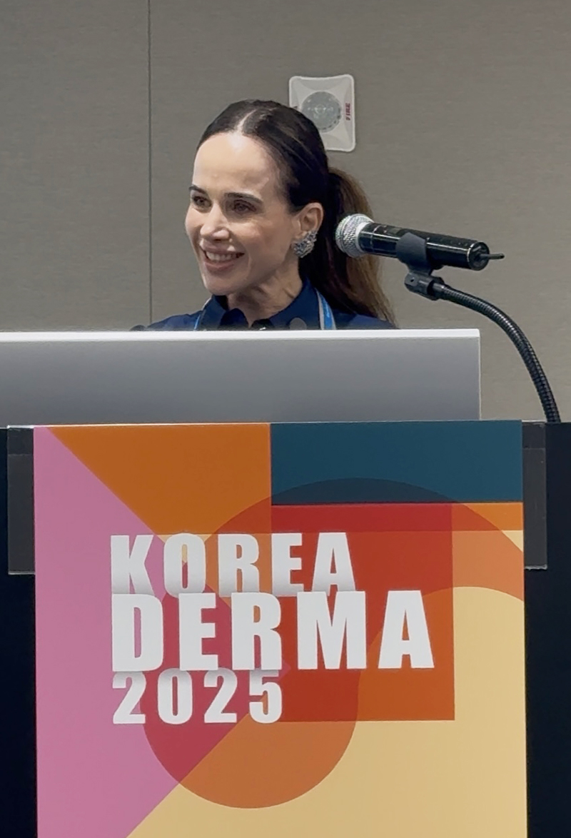 Dra. Michella Rezende no Korea Derm 2025, apresentando sua técnica de tratamentos híbridos