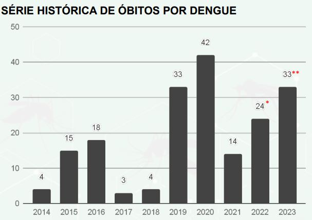 Segundo o boletim divulgado hoje (19) pela Secretaria de Estado de Saúde (SES), já são 33 óbitos pela doença, sendo que na semana passada eram registrados 31, um aumento de 6,45%. Esse é o maior índice desde 2020, quando 42 pessoas morreram.