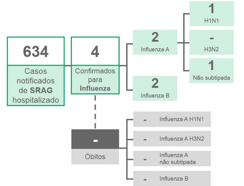 Desses números, quatro foram confirmados, sendo 2 para Influenza A e 2 para Influenza B. Ainda não há óbitos pela doença. Agora se tratando das notificações, Campo Grande é líder com 354 casos. Dourados (25), Corumbá (25), Sidrolândia (19) e Três Lagoas (15) são as cinco cidades com os maiores índices. A maioria das notificações é em mulheres com 319 casos e em homens com 315.