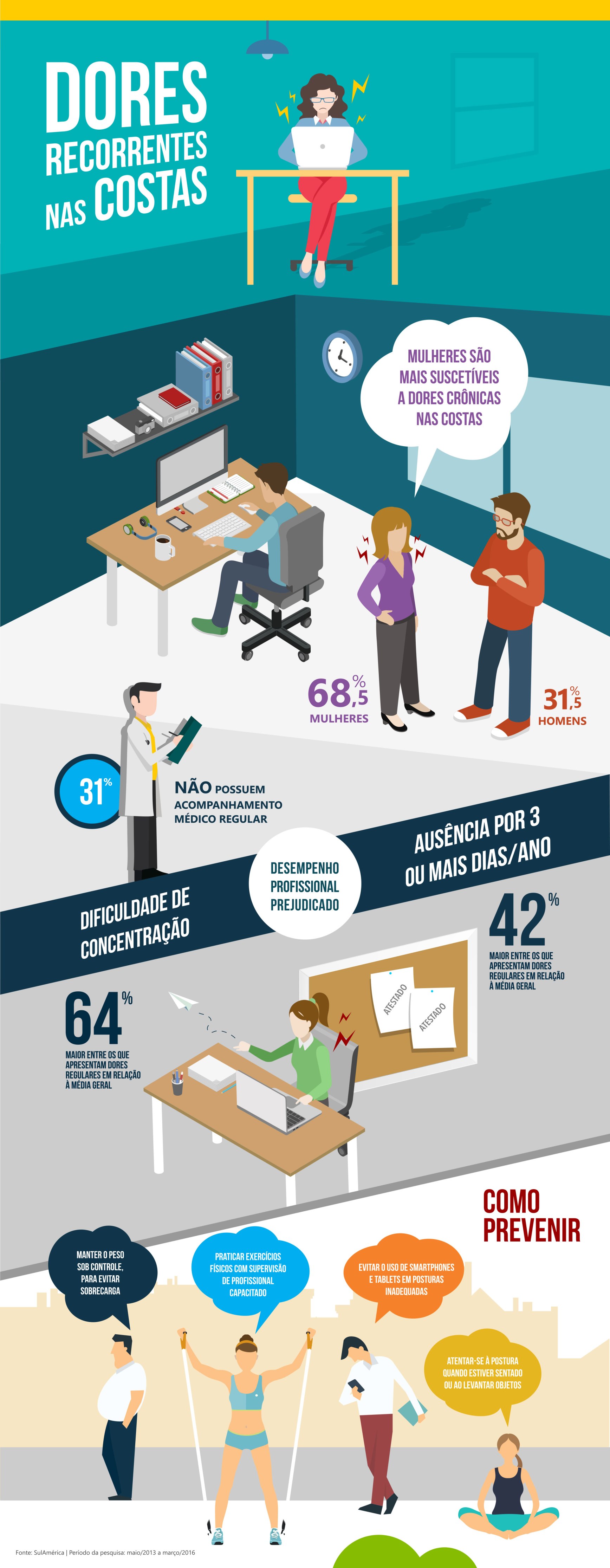Dores crônicas nas costas afetam mais mulheres que homens e impactam a produtividade no ambiente de trabalho. É o que revela estudo da SulAmérica, realizado entre maio de 2013 e março de 2016, com mais de 13 mil segurados da companhia. De toda a base analisada, aproximadamente mil indivíduos informaram sofrer de dores recorrentes nas costas. As mulheres representam 68,5% do grupo impactado pelo problema – e a cronicidade piora entre as seguradas de 41 a 60 anos, o que, segundo a diretora Técnica e de Relacionamento com Prestadores da SulAmérica, Dra. Tereza Veloso, pode estar relacionado ao histórico de gestações, e consequente aumento de peso, e também à menopausa.