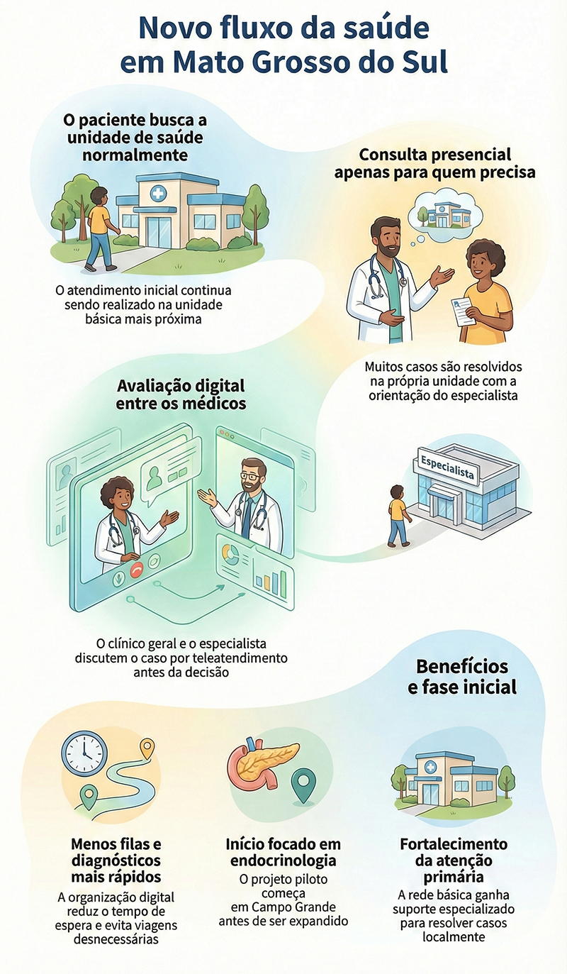 O foco é organizar melhor os atendimentos, reduzir deslocamentos desnecessários e agilizar diagnósticos - (Foto: Arte A Crítica)Começa pela endocrinologia - A implantação inicial será feita em Campo Grande, começando pela especialidade de endocrinologia. A ideia é testar o modelo, ajustar o fluxo e, aos poucos, ampliar para outras áreas médicas e municípios do Estado.