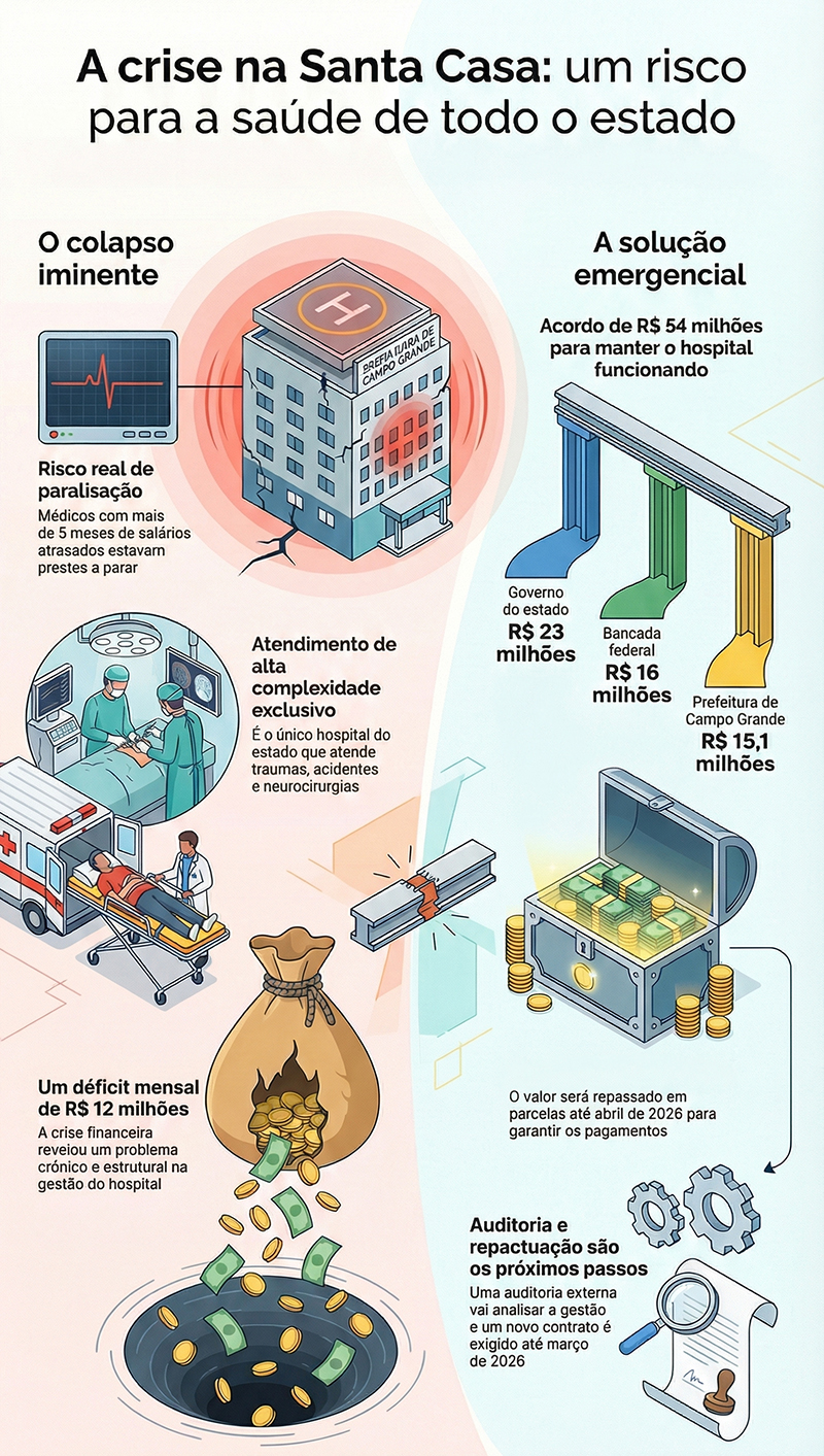 Para evitar o pior, foi firmado um acordo emergencial com repasses que somam R$ 54 milhões — vindos do Governo do Estado, Prefeitura de Campo Grande e da bancada federal. O pagamento será parcelado até abril de 2026 - (Foto: Arte A Crítica)O procurador-geral também lembrou que esse cenário de exclusividade no atendimento de trauma é frágil e exige repactuação urgente. “Não é razoável que um Estado como Mato Grosso do Sul dependa de um único hospital para casos tão críticos”, afirmou.
