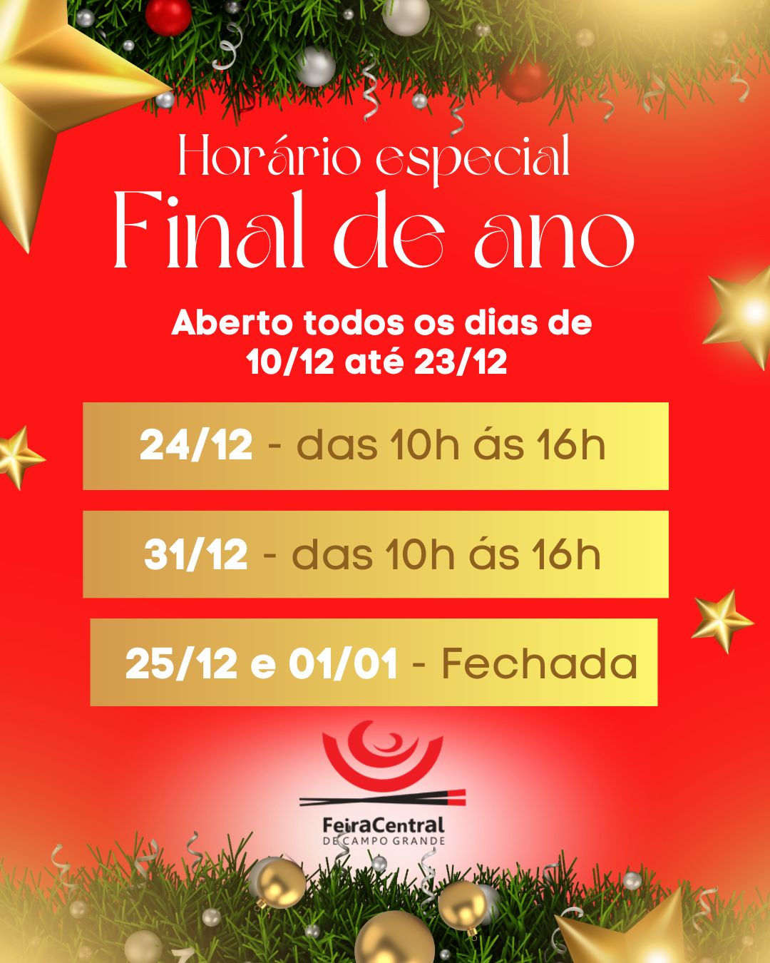 Quem ainda não garantiu os presentes de Natal terá mais oportunidades de fazer compras na Feira Central de Campo Grande neste mês. Além dos dias regulares de funcionamento, o espaço abrirá hoje e amanhã (segunda e terçafeira) e também nos dias 22 e 23 de dezembro, oferecendo mais tempo para os visitantes escolherem produtos e aproveitarem a atmosfera festiva.
