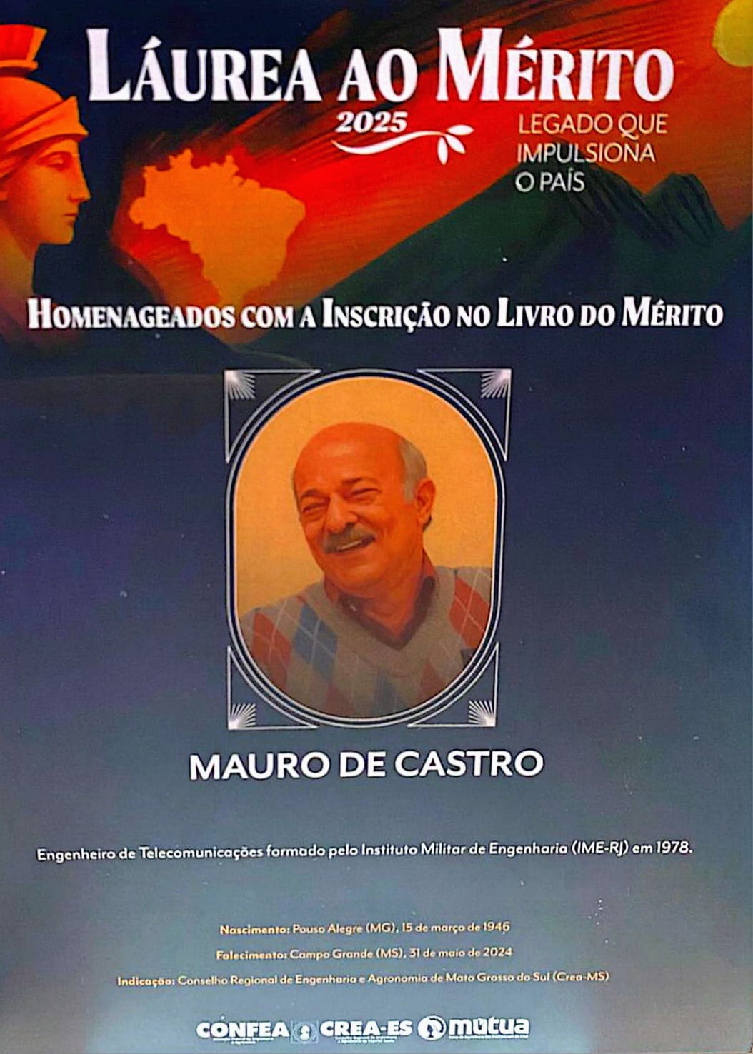 Sistema Confea/Crea e Mútua realizou, na noite desta terça-feira (7), a cerimônia da Láurea ao Mérito 2025 durante a 80ª Semana Oficial da Engenharia e da Agronomia (Soea), em Vitória (ES). O Confea (Conselho Federal de Engenharia e Agronomia) prestou homenagem a profissionais falecidos inscritos no Livro do Mérito. Entre os homenageados esteve o engenheiro de telecomunicações Mauro de Castro, mineiro radicado em Campo Grande.