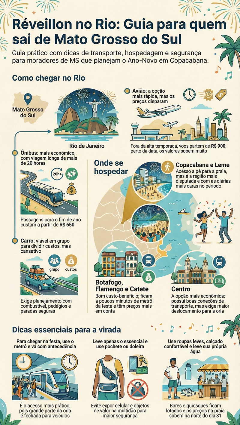 Se você é de Mato Grosso do Sul e sonha em virar o ano de frente para o mar de Copacabana, dá tempo de se organizar - (Foto: Arte A Crítica)A seguir, o jornal A Crítica reúne quanto custa sair de Campo Grande para o Rio, como chegar, onde é mais fácil se hospedar e o que esperar da virada na orla.