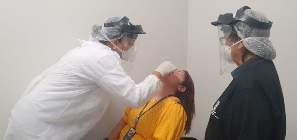 Os técnicos da Sesau fazem a abordagem e a triagem inicial do passageiro na sala de desembarque e o direciona para o local onde é realizado o teste de antígeno (Swab), que fica pronto de 15 a 20 minutos e possui alto grau de confiabilidade.
